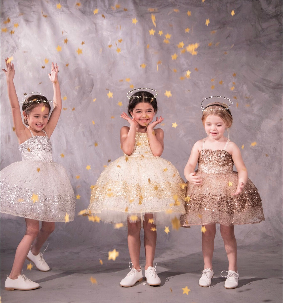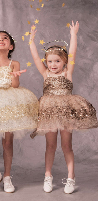 With a dusting of glittery paillettes, this dress pops with woven metallic threads over a plump petticoat. Pair it with a traditional sash for a modern take on the flower girl or the perfect party dress.